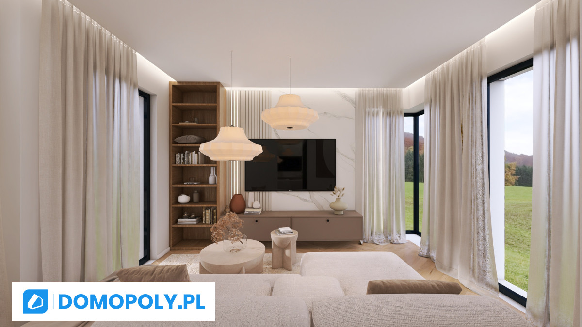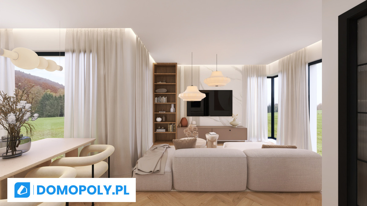- jasny salon z dużym oknem i wyjściem do ogrodu,