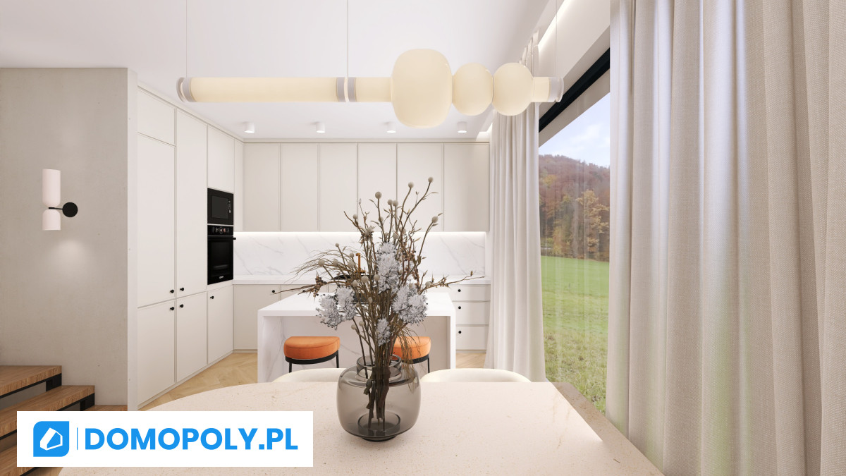 - kuchnię z oknem i pełną wysokością pomieszczeń,