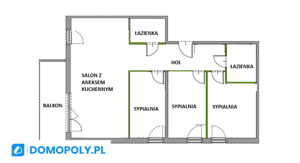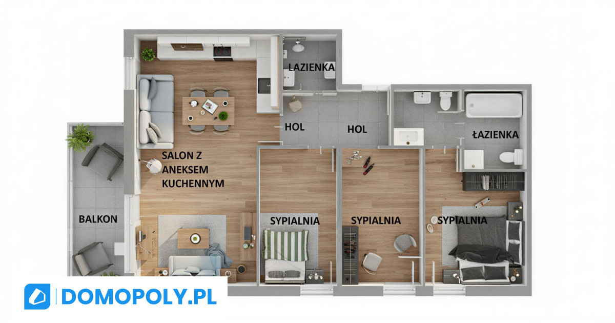 Układ: 3 sypialnie, duży salon (strefa dzienna), 2 łazienki