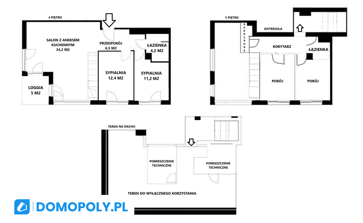- Antresoli 36,5 m2, gdzie można wydzielić 2 osobne pokoje, łazienkę oraz garderobę.