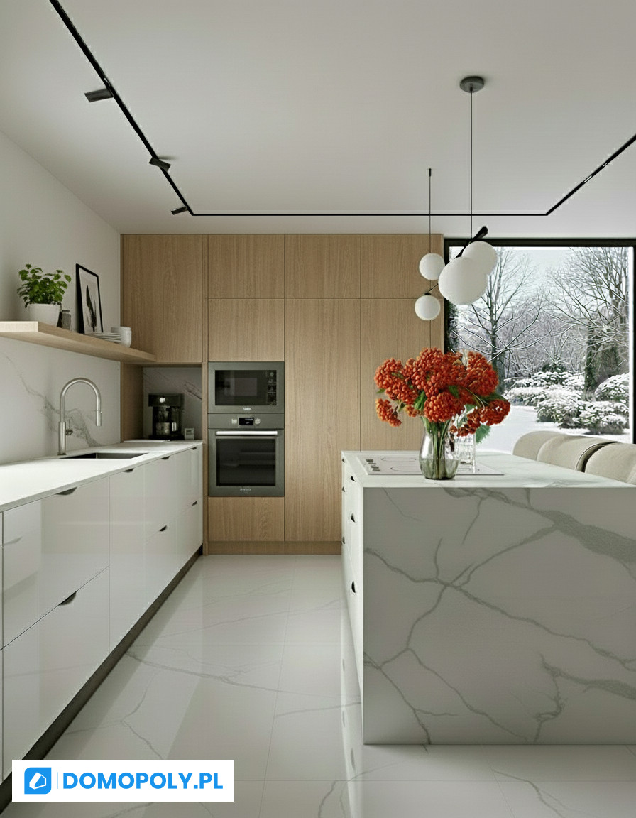 - Otwarta kuchnia z dużym oknem z wyjściem na taras