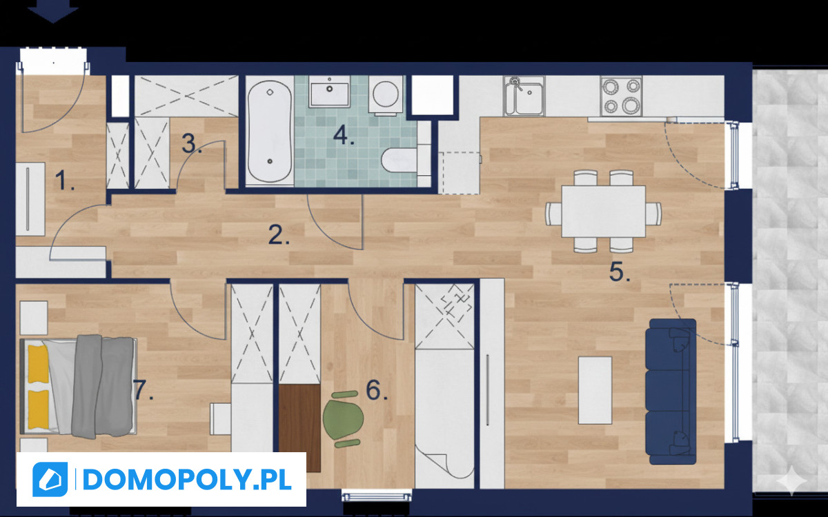 Rozkład pomieszczeń został zaprojektowany tak, by zapewnić maksimum komfortu i prywatności. Duży salon z aneksem kuchennym stanowi serce mieszkania - idealne miejsce do relaksu i spotkań z bliskimi.