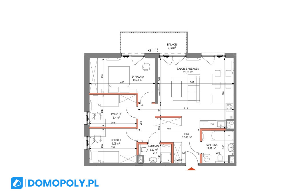 Funkcjonalny układ - duży hol (12,43 m²) i balkon (7,33 m²)
