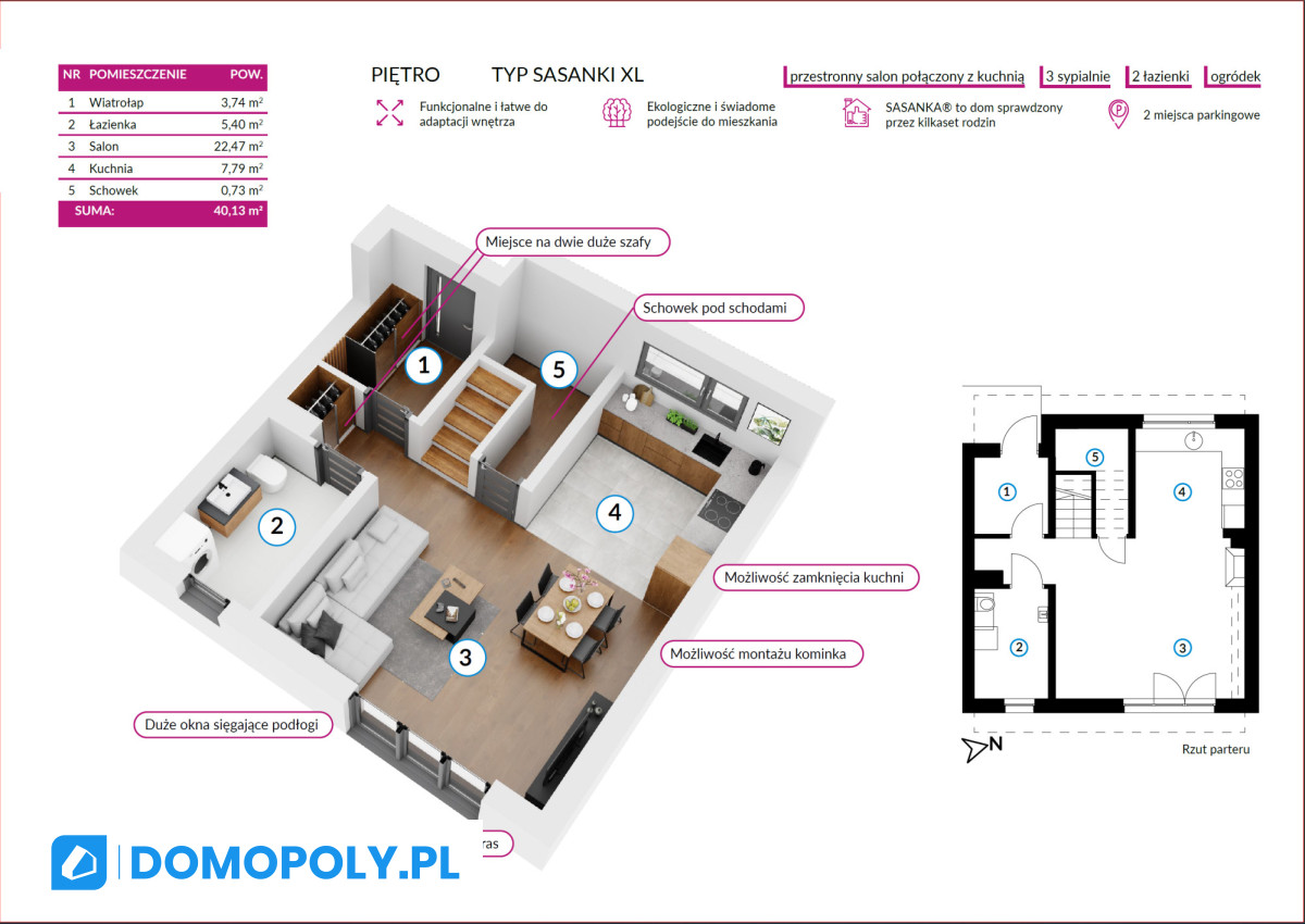 - Przestronny salon (22 m²) - idealne miejsce na wspólne chwile, z wyjściem na Twój ogród
