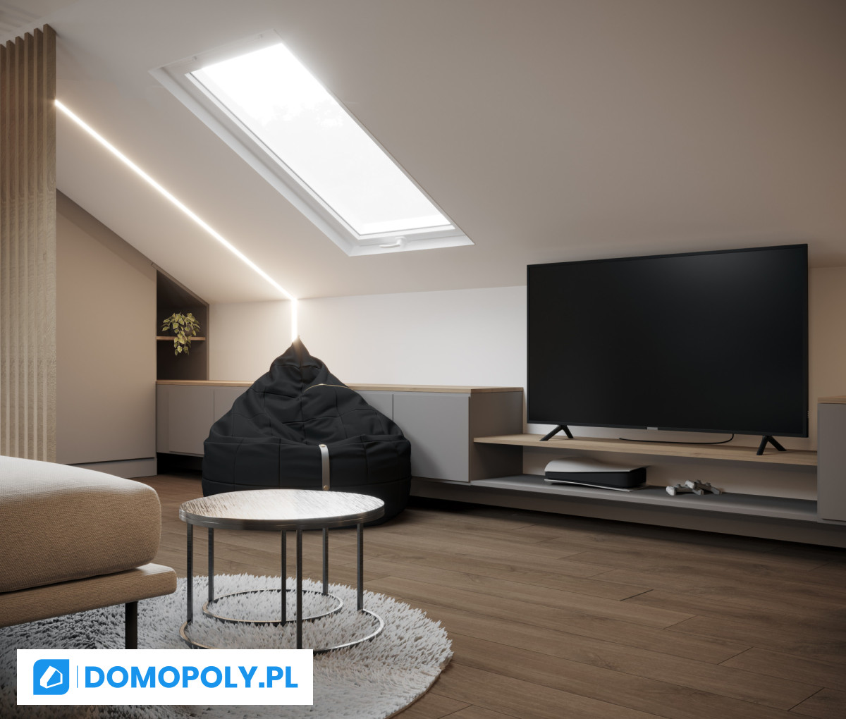 - Parter: przestronny salon z aneksem (33 m²), dodatkowy pokój, łazienka, kotłownia