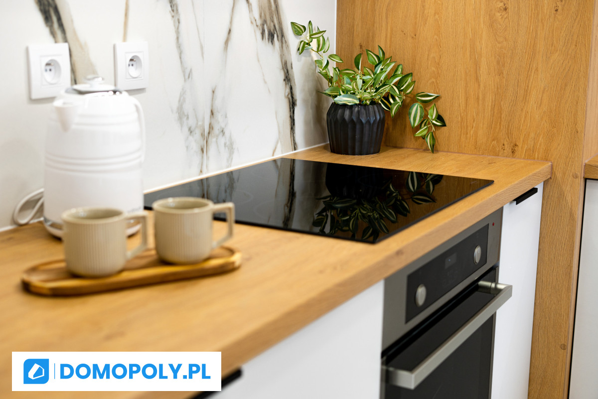 - Kuchnia z jadalnią a w niej okrągły stół i dwa krzesła. W kuchni do dyspozycji mamy piekarnik, zmywarkę, płytę indukcyjną, toster, czajnik oraz wyposażenie w sztućce, naczynia, kubki itd.