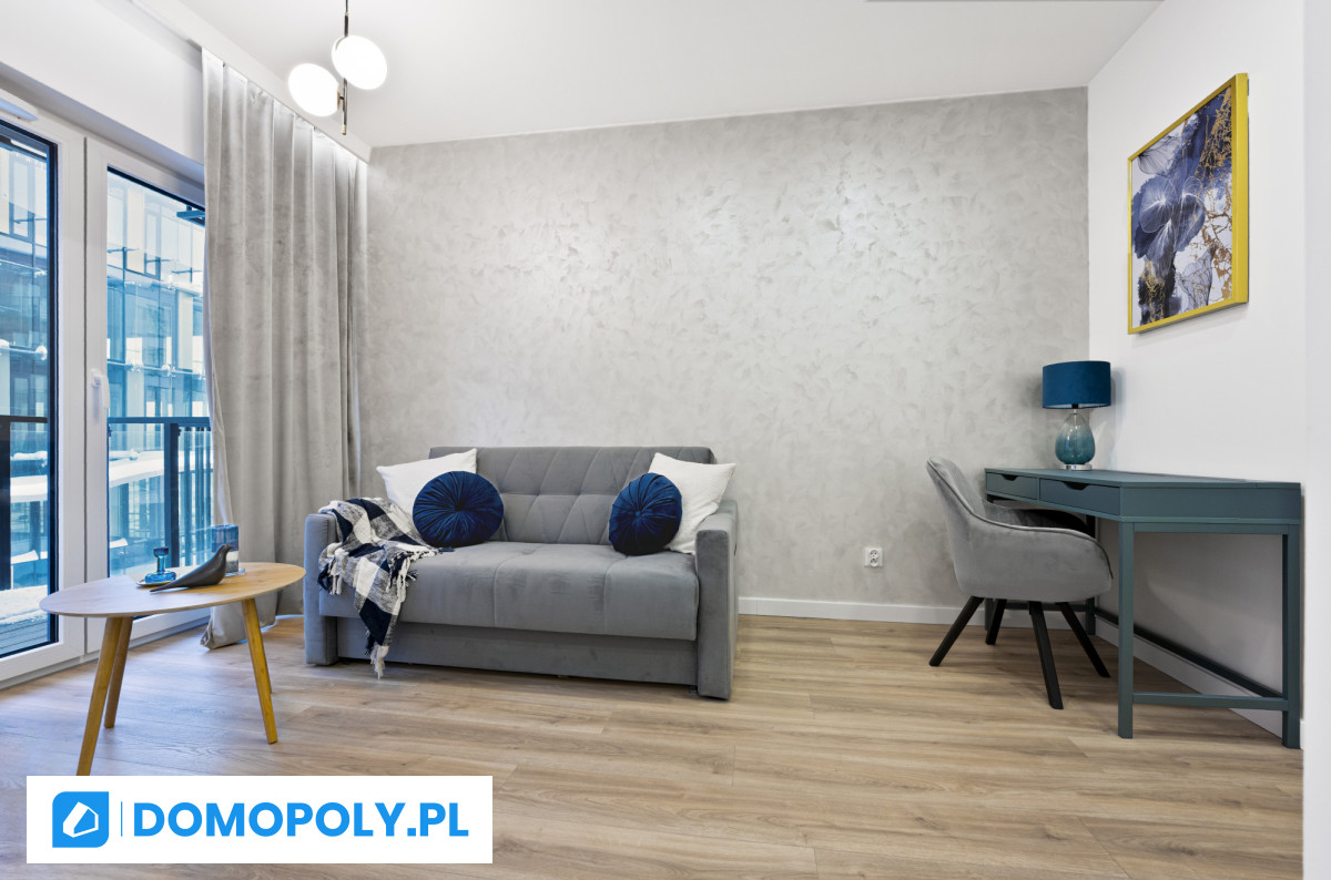 - Salon z aneksem kuchennym - pełnowymiarowa rozkładana sofa oraz duża kuchnia z jadalnią do tego mamy również biurko - miejsce do pracy