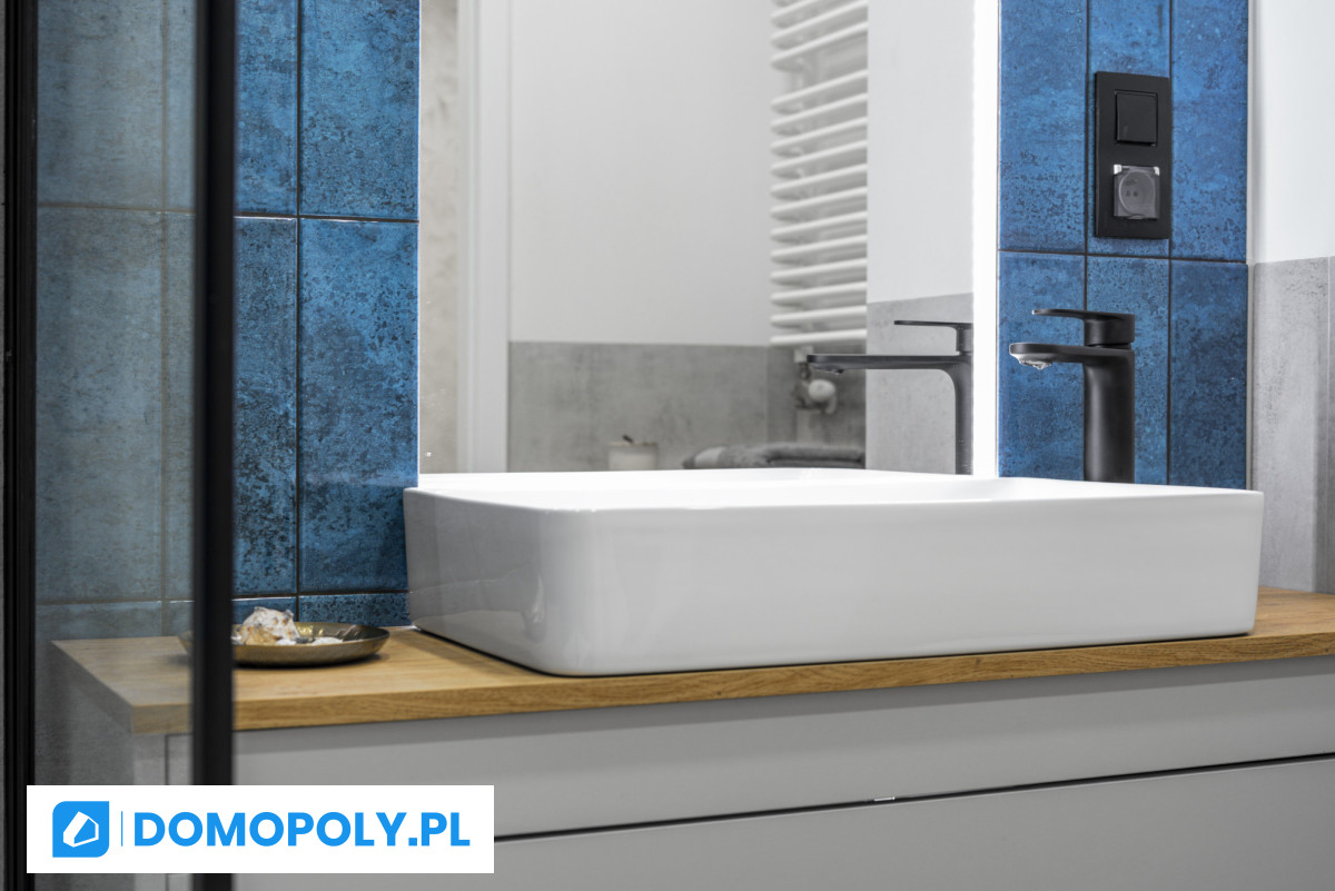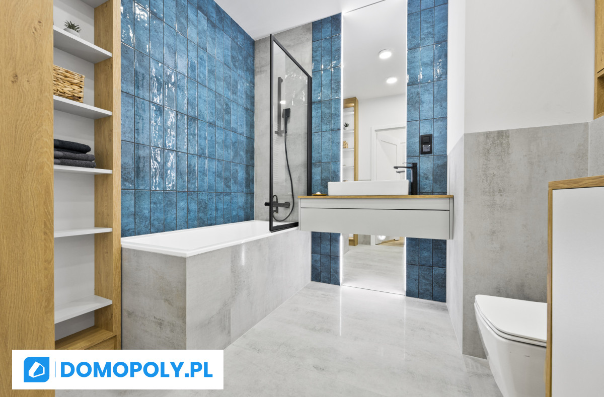 - Duża łazienka wykończona w pięknej niebieskiej kolorystyce z wanną i prysznicem. Łazienka oczywiście wyposażona w pralko-suszarkę.