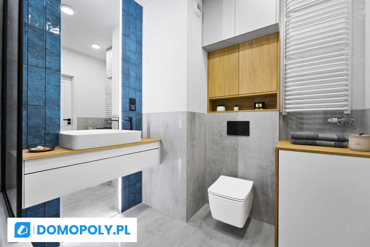 - Duża łazienka wykończona w pięknej niebieskiej kolorystyce z wanną i prysznicem. Łazienka oczywiście wyposażona w pralko-suszarkę.