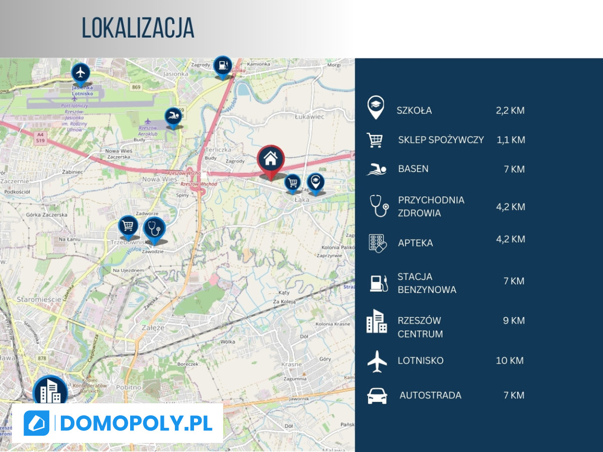 Gmina Trzebownisko ma rozwiniętą infrastrukturę, w tym sklepy, szkoły i ośrodki zdrowia w niedalekiej odległości: