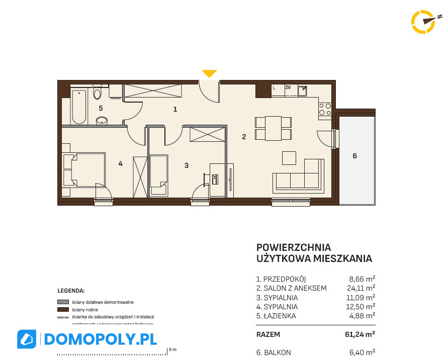 Funkcjonalny układ (61,5 m²): Przemyślana przestrzeń z dwiema ustawnymi sypialniami i przestronnym salonem.