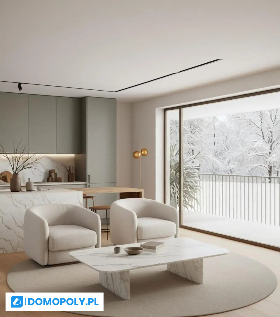 Salonu z aneksem kuchennym - 27 m2 - świetna przestrzeń na kuchnię wraz ze częścią jadalną oraz miejscem do odpoczynku z dużym narużnikiem
