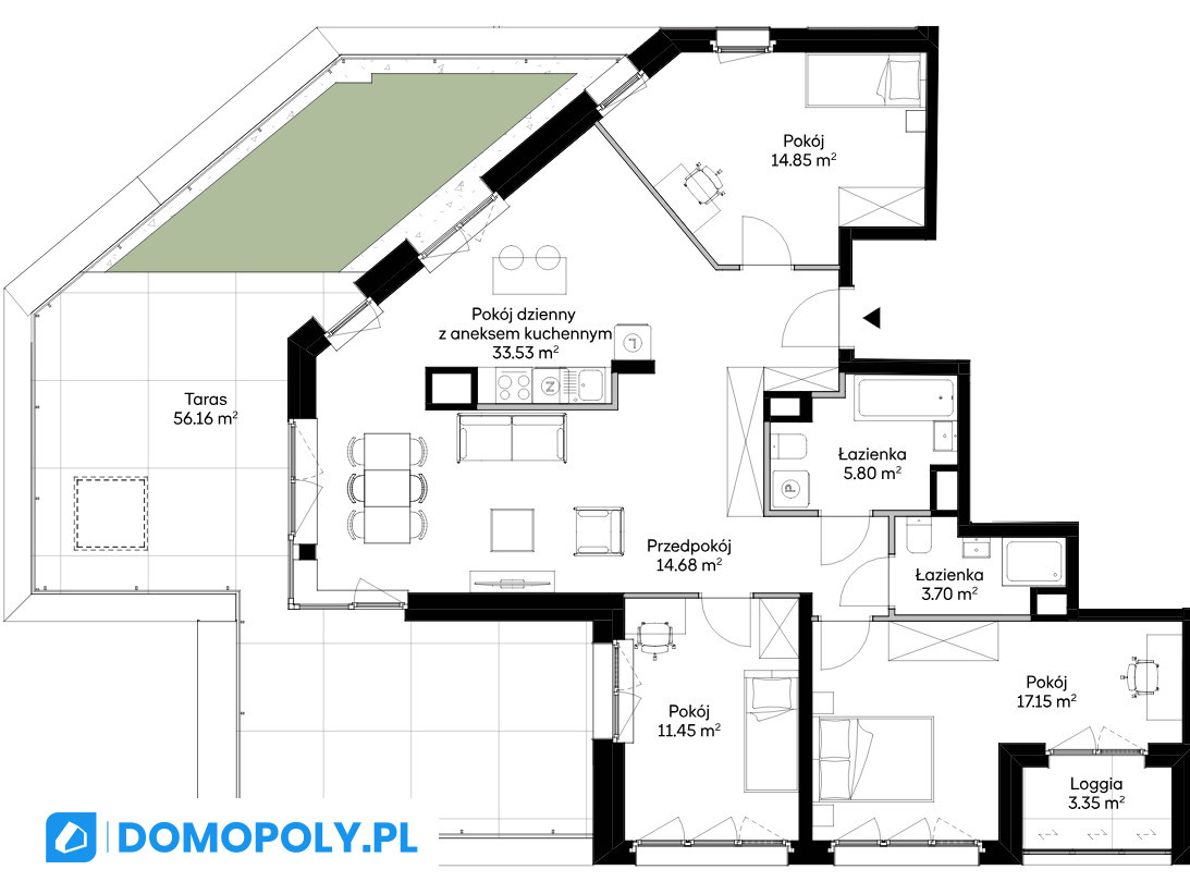 Trzy przestronne sypialnie (17,15 m², 14,85 m² oraz 11,45 m²) zapewnią komfort całej rodzinie lub pozwolą zaaranżować prywatny gabinet i pokój gościnny. W głównej sypialni znajduje się dodatkowa loggia (3,35 m²), idealna na chwilę wytchnienia. Do dyspozycji są dwie eleganckie łazienki - większa (5,80 m²) i mniejsza (3,70 m²) - co daje maksimum wygody na co dzień.
