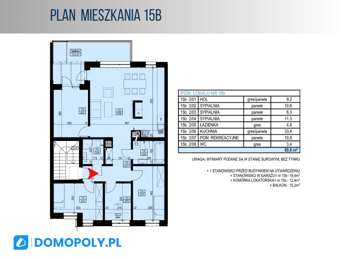 ◼︎ Powierzchnia mieszkania: 89,9 m² / Balkon: 15,21 m² / Garaż: 19,5 m² / Komórka lokatorska: 12,4 m²