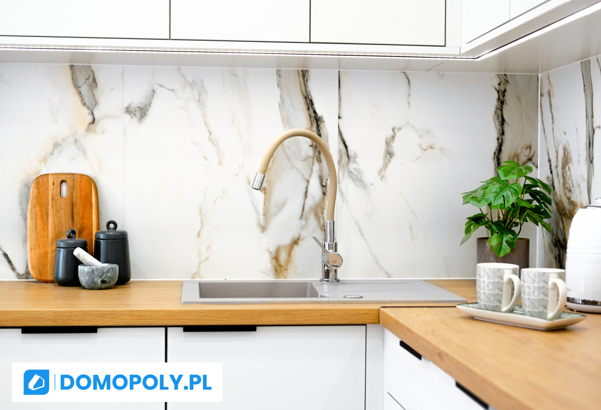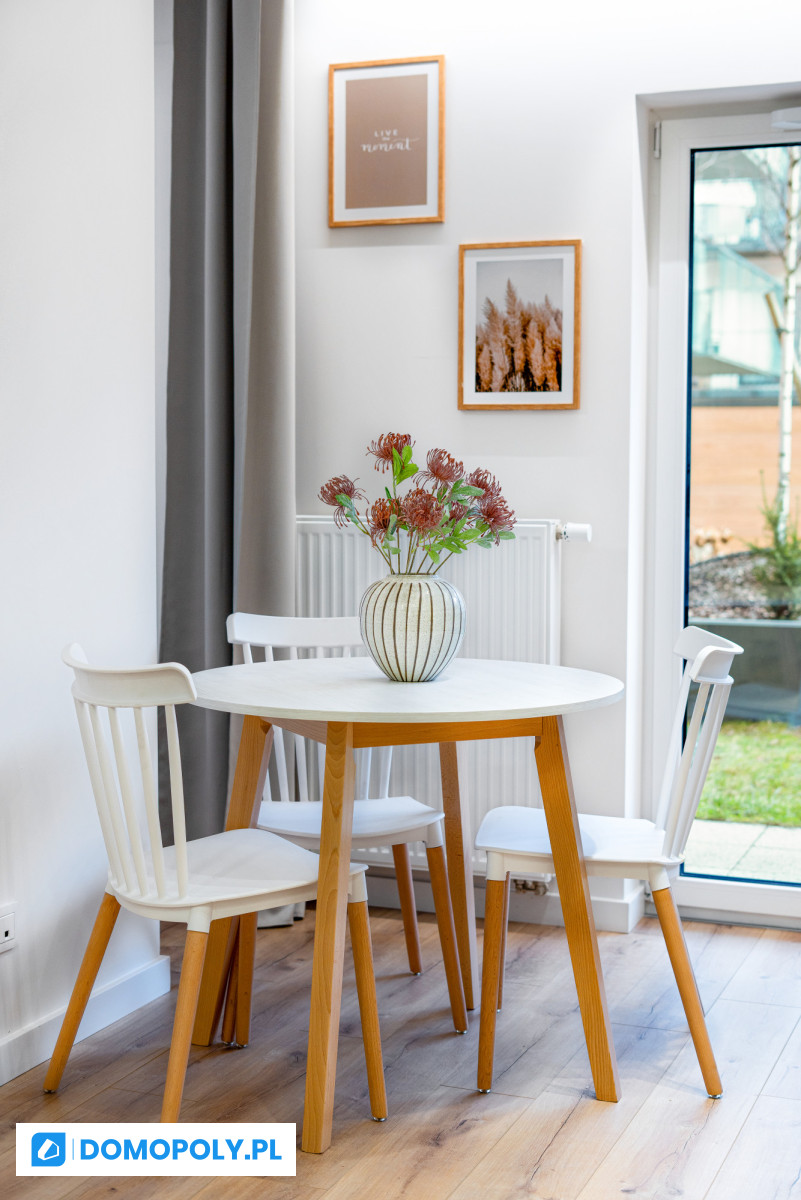 - Kuchnia z jadalnią a w niej okrągły stół i dwa krzesła. W kuchni do dyspozycji mamy piekarnik, zmywarkę, płytę indukcyjną, toster, czajnik oraz wyposażenie w sztućce, naczynia, kubki itd.